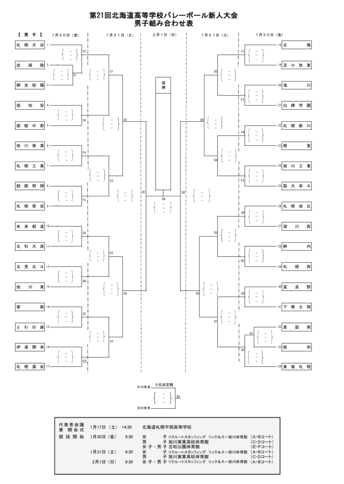 2025年度 武ダGEAD株式会社杯 第21回北海道高等学校バレーボール新人大会 競技日程:令和8年1月30日(金)〜2月1日(日) 場所:リクルートスタッフィング リック&スー旭川体育館、旭川実業高校体育館、忠和公園体育館 <速報ページ> 1月30日(男子) 1月30日(女子) 1月31日(男子) 1月31日(女子) 2月1日(男女)